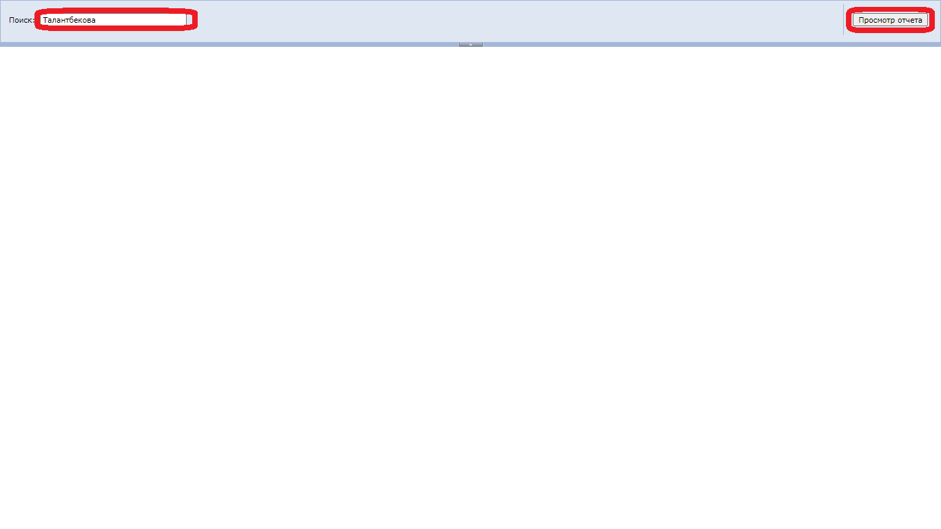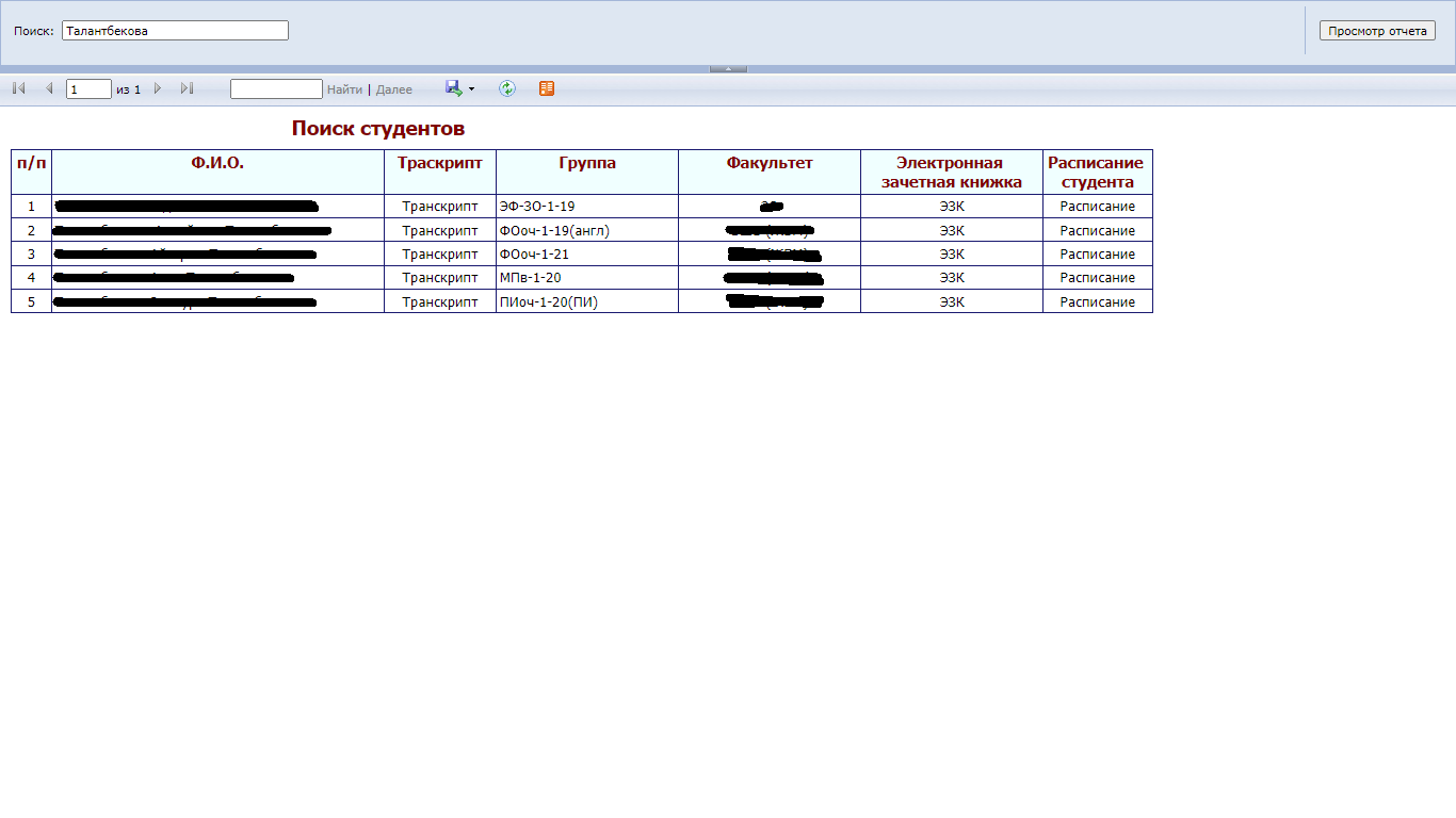 Далее в строке Поиск, которая расположена верхней правой части новой открывшейся страницы, необходимо ввести Фамилию студента и нажать на кнопку Просмотр отчета в правом верхнем углу страницы (Рисунок 2).